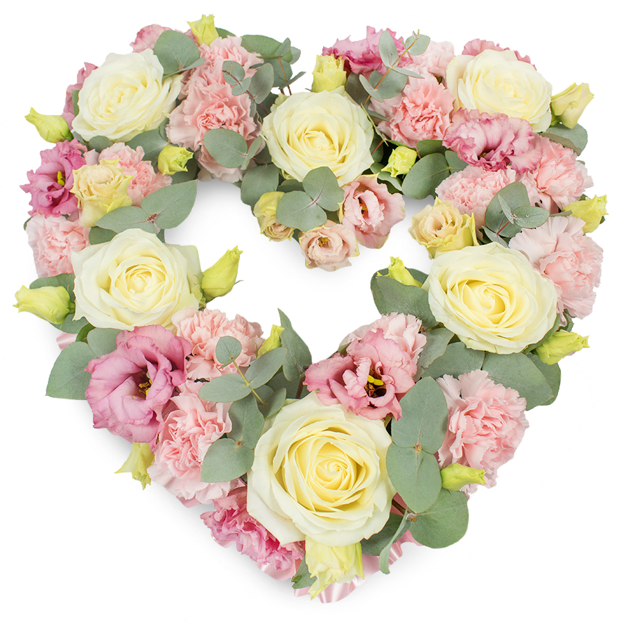 Convey your heartfelt condolences with our Classic Open Heart Sympathy Floral Arrangement. This elegant bouquet features pure white roses, soft pink carnations, and delicate pink lisianthus, beautifully arranged with aromatic Eucalyptus leaves.